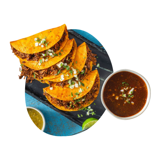 Tacos de camarón con arrachera, tortillas de harina, queso oaxca, guacamole, cebolla y cilandro.