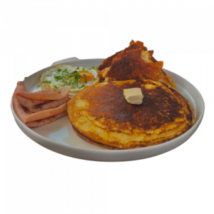 Carne de res (150 grs). Piña, jamón, queso oaxaca, queso tipo americano, cebolla, lechuga, jitomate. Acompañada de papas a la francesa.