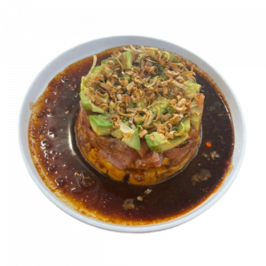 Salchicha de res, alambre de res, mayonesa, guacamole y pico de gallo, queso Oaxaca y chiles toreados.