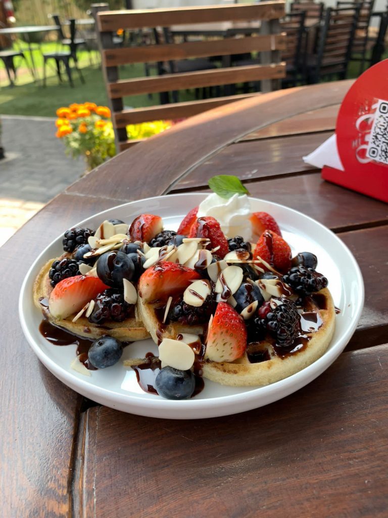 el lugar es muy agradable pero la comida no tiene sabor, servicio lento y además se equivocaron 2 veces y nos dimos cuenta que la comida es congelada, las fresas no tienen nada de especial, el lugar es bueno para ir a beber con amigos pero no si quieres una comida o desayuno familiar, las instalaciones tienen potencial ojalá mejoren sus alimentos tenía altas expectativas y me decepcionó